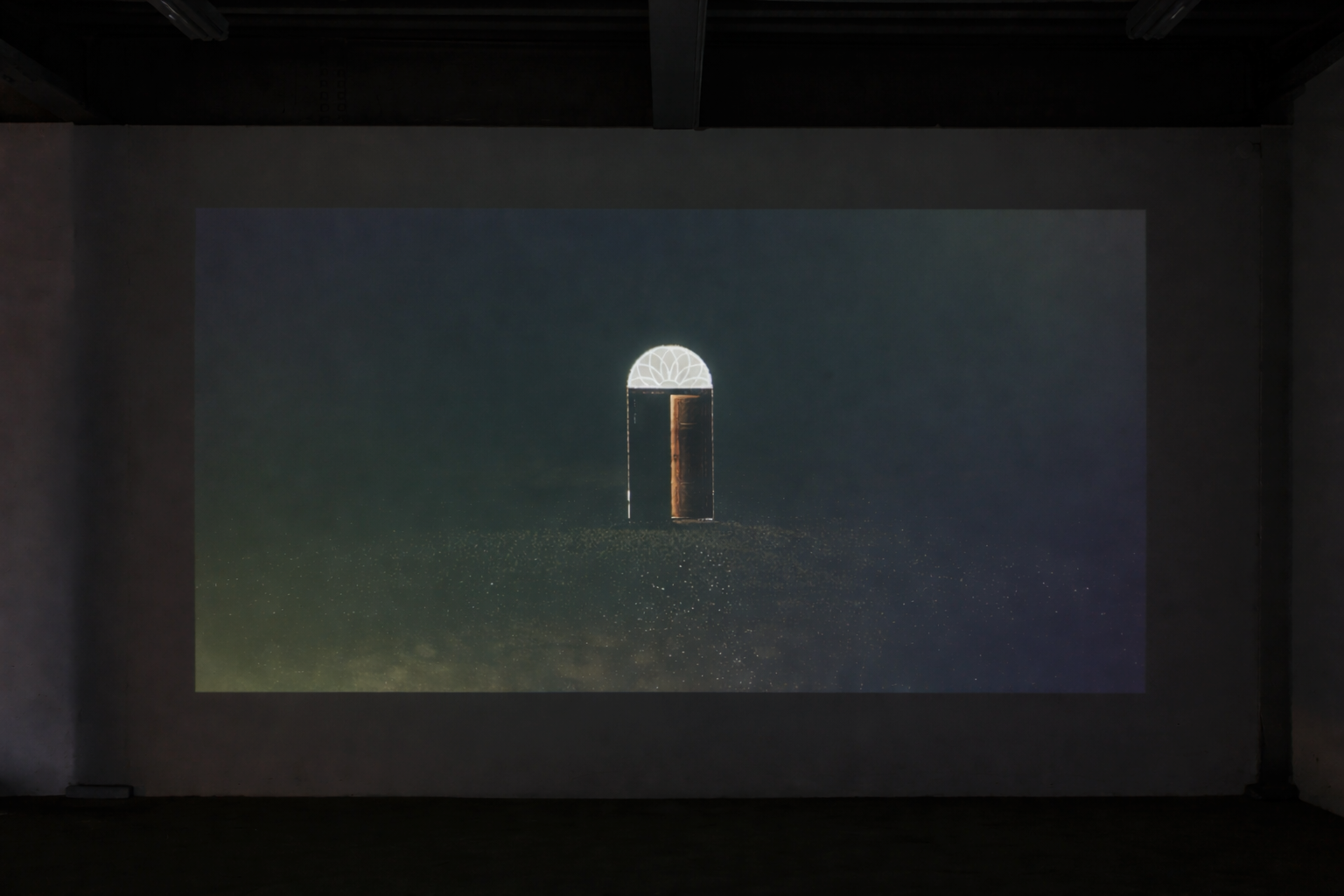 The video focuses on a closed door in a completely dark space, lit only by the faint glow seeping in from the room behind it. Amid the rhythmic fluttering of a moth’s wings and the creaking of the door, the door swings open and shut repeatedly at high speed.